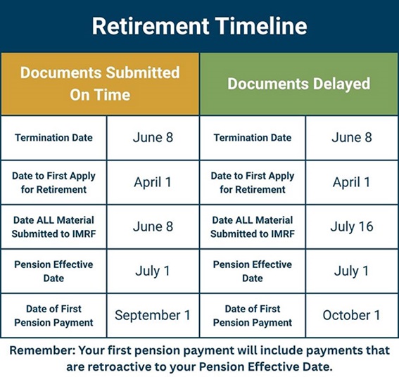 IMRF members should apply for retirement between 30 and 60 days before their pension effective dates. Applying more than 90 days before your pension effective date can cause delays in the application process.